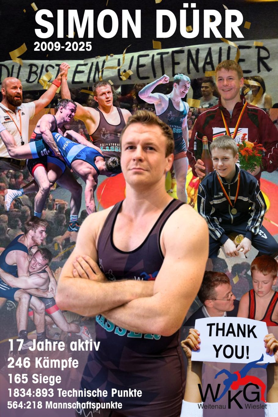 Nach 17 intensiven Jahren auf der Matte endet eine Ära: Simon Dürr beendet seine aktive Karriere – doch seine Verbindung zum Verein bleibt ungebrochen. Von 2009 bis 2025 trat er insgesamt 246 Kämpfen an. 165 Einzelsiege, 1.834 technische Punkte und 564 Mannschaftspunkte stehen als nüchterne Zahlen in den Statistiken. Hinter ihnen aber verbergen sich Geschichten von Hingabe, Durchhaltevermögen und tiefer Verbundenheit.
